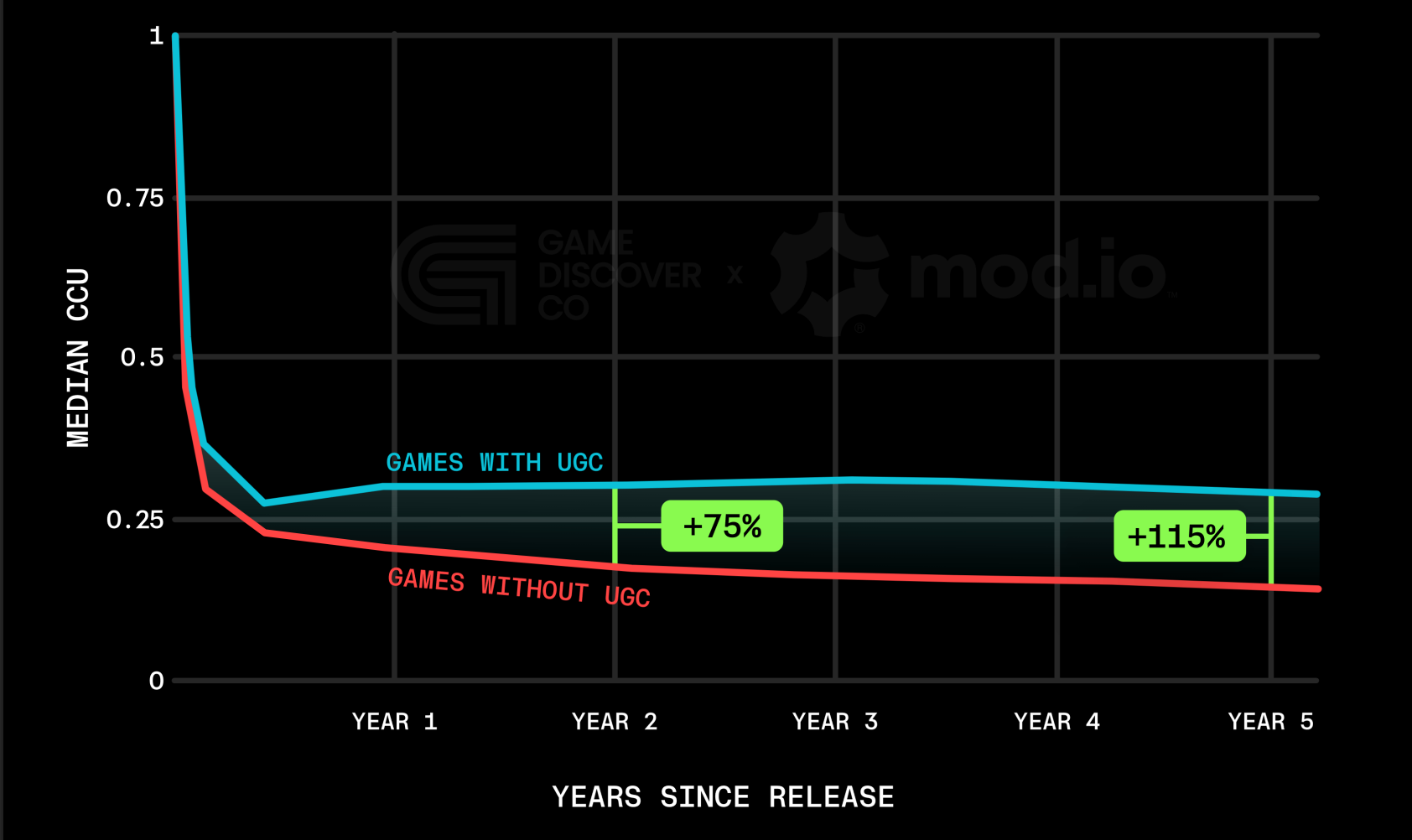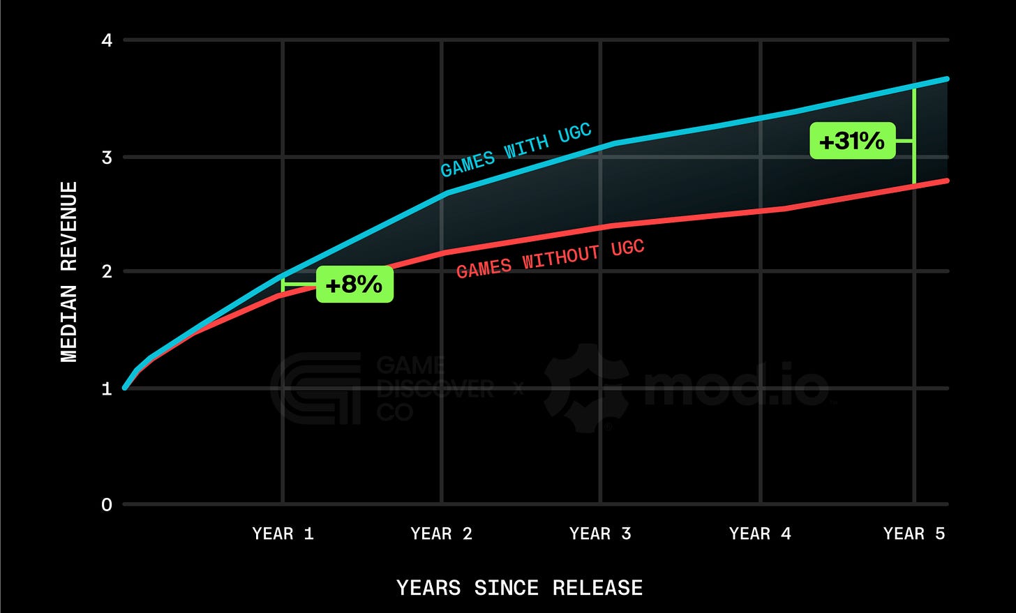 In the gaming world, UGC is no longer a nice-to-have; it’s a proven growth strategy. A new UGC Impact Study (2025) by mod.io and GameDiscoverCo analyzed hundreds of games and found that those supporting UGC significantly outperformed their peers. After one year, UGC-friendly games earned an 8% revenue lift, growing to 31% over five years. They also enjoyed better retention and stronger community loyalty.